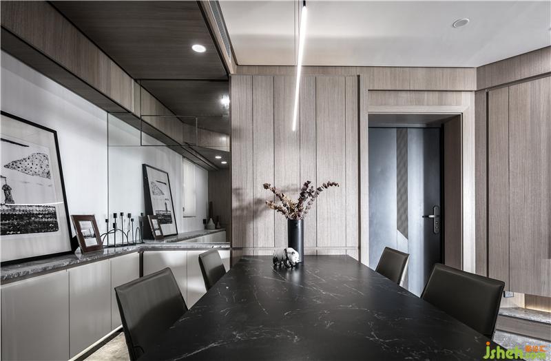 白色紋路的黑色巖板餐桌讓空間提升了一份質(zhì)感,搭配黑色的餐椅、木飾面的背景,以及白色的矮柜,不同的色調(diào),讓空間整體顯得十分協(xié)調(diào),讓餐廳小空間也變得大了起來。