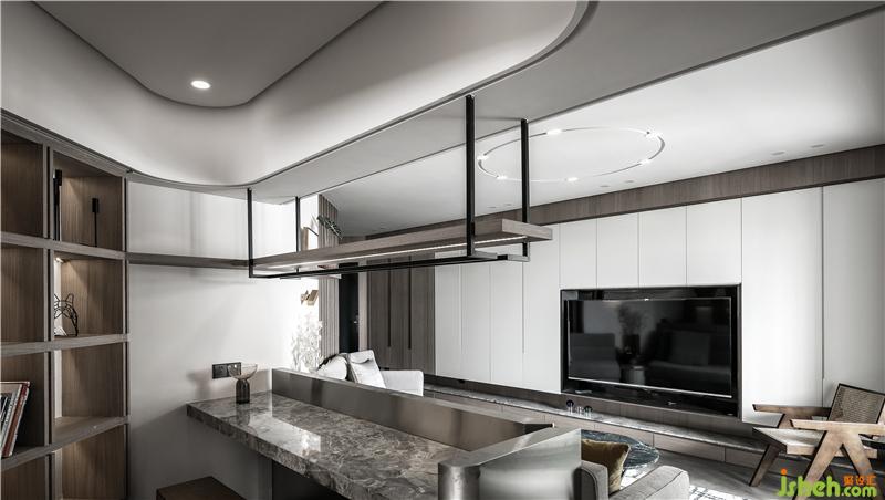 吧臺(tái)區(qū)用了大部分的金屬面,臺(tái)面部分為大理石,搭配一張木色的長凳。格外有意境。吧臺(tái)的主要燈光為上方的吊燈,木色的燈具,用黑色鐵藝固定,中間挖槽暗藏?zé)魩А?nbsp;