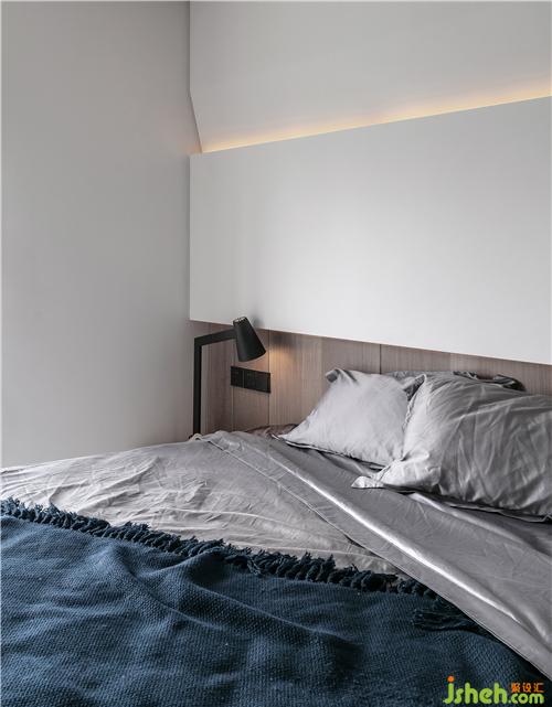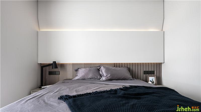 主臥背景墻采用木飾面+木格柵形式,以淺色調(diào)塑造自然、質(zhì)樸的氣息。上方為白色烤漆面的柜體作為硬包背景。上方暗藏?zé)魩А?