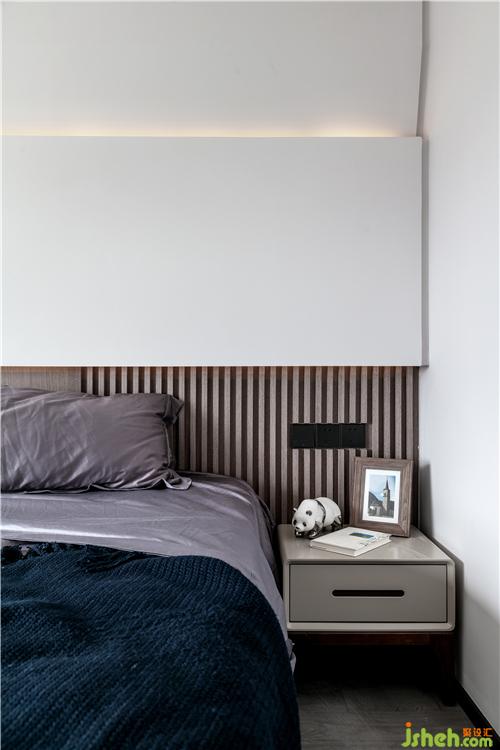 床頭柜邊緣柔和圓潤,不會(huì)使人磕碰受傷。淺色的灰白色的床頭柜中和了色彩明亮的床品所帶來的沖擊。