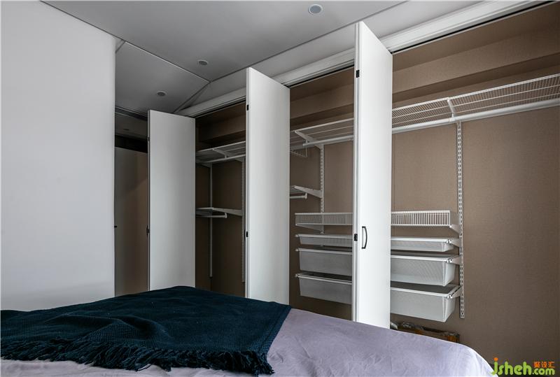 臥室的一整面的頂天立地的衣柜,白色烤漆柜門搭配黑色的柜門拉手,柜門為折疊門,里面是業(yè)主挑選的抽拉置物架。白色的衣柜可以讓空間顯得更加簡潔,也讓衣柜看起來不那么占用空間。