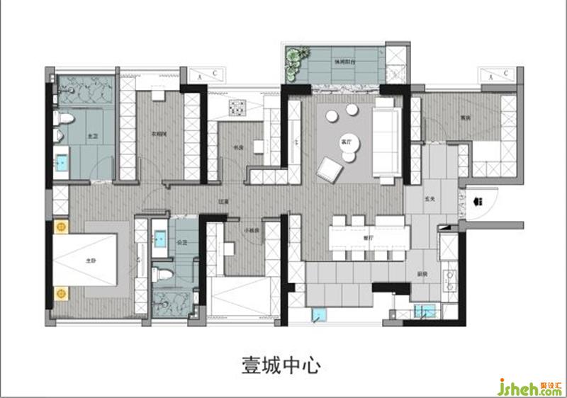 客廳通往小陽臺的中間設(shè)置了雙層窗簾,滿足空間不同時段的光線環(huán)境需求。