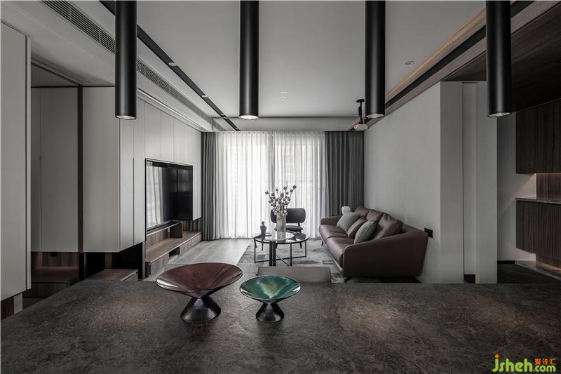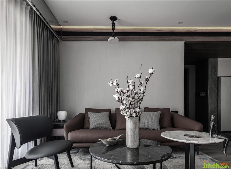 The living room is equipped with a projector to meet the needs of the owners who want to use the projection screen to watch movies. The background wall of the sofa uses the blank wall surface, and the 5mm process joint makes the white wall no longer monotonous. The curtain box used mirror steel, the overall effect of the whole space has an extended sense, not rigidly stuck in the small house.