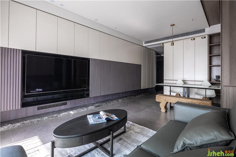 電視背景墻上面白色的是烤漆柜門(可儲物),下面是現(xiàn)場人工制作的,也是柜門,具有儲物功能。右邊黑色部分是展示柜,用的是黑色不銹鋼,里面暗藏燈帶。