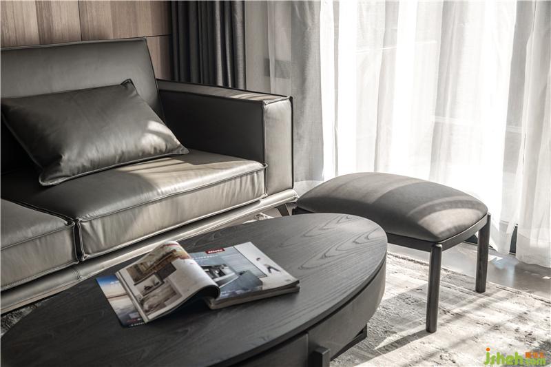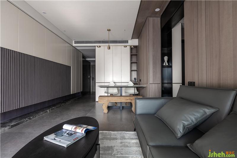 材質:木飾面、烤漆柜門、皮質沙發(fā)、不銹鋼、瓷磚、科定板、木質茶幾、不銹鋼、雙層窗簾