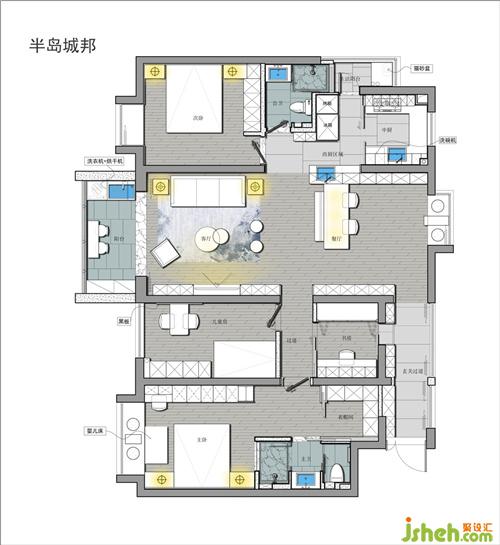 這個(gè)戶型是兩套小戶型打通合并而成,但是承重墻體比較多,做了較保守的改動(dòng),根據(jù)業(yè)主的想法,室內(nèi)設(shè)計(jì)師希望有一個(gè)與老人互不打擾的空間,于是形成了這個(gè)雙路徑的方案,業(yè)主晚上回家時(shí),可以直接從玄關(guān)的書房通道進(jìn)入主臥,不會(huì)吵醒休息的老人,兩位業(yè)主會(huì)定時(shí)外出旅行運(yùn)動(dòng),所以需要非常大的儲(chǔ)物量來安置運(yùn)動(dòng)物品與衣物。每個(gè)區(qū)域都有柜子,體現(xiàn)了就近收納的理念。