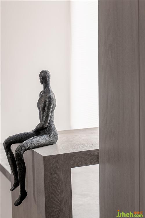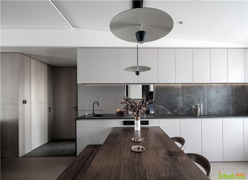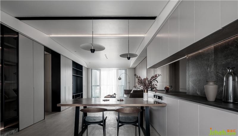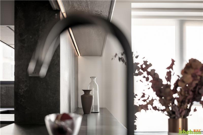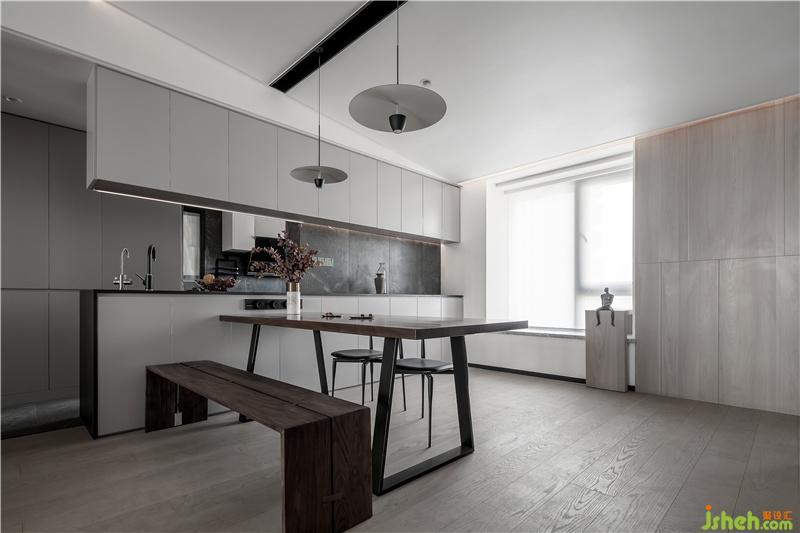 西廚吊柜底部設(shè)計(jì)了一條感應(yīng)燈帶,吧臺(tái)增加了一處清洗區(qū),增加西廚的功能, 在材質(zhì)的選擇上采用了銀灰色的巖板,克制的選色也最大程度的還原了簡約的性格,可移動(dòng)的小桌子,飄窗可以坐著飲茶和看書。