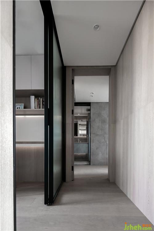 書房的長虹玻璃門是吊軌式的,這種工藝需要在前期天花設(shè)計(jì)時(shí)預(yù)留軌道槽,地面不用安裝軌道,解決了傳統(tǒng)推拉門軌道清潔的痛點(diǎn)。