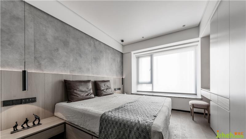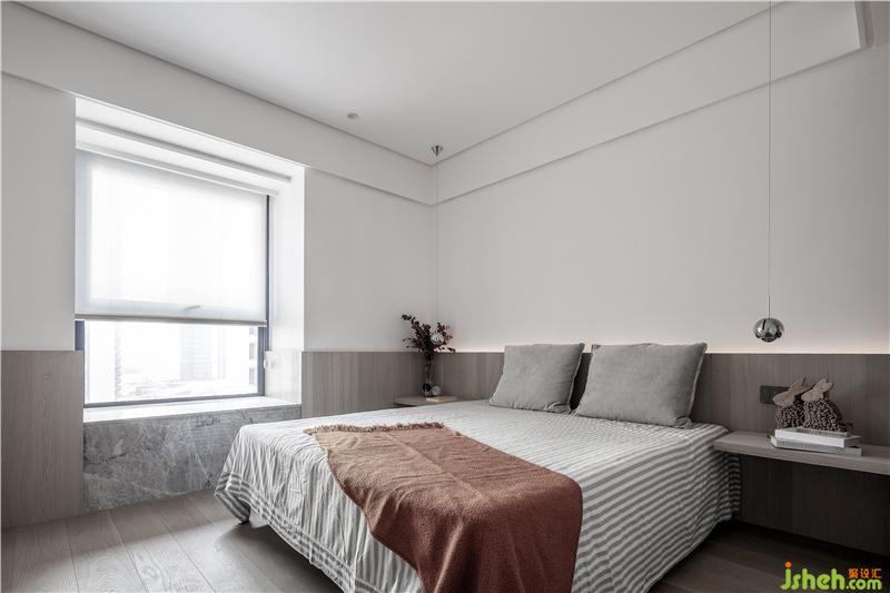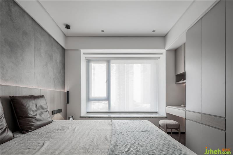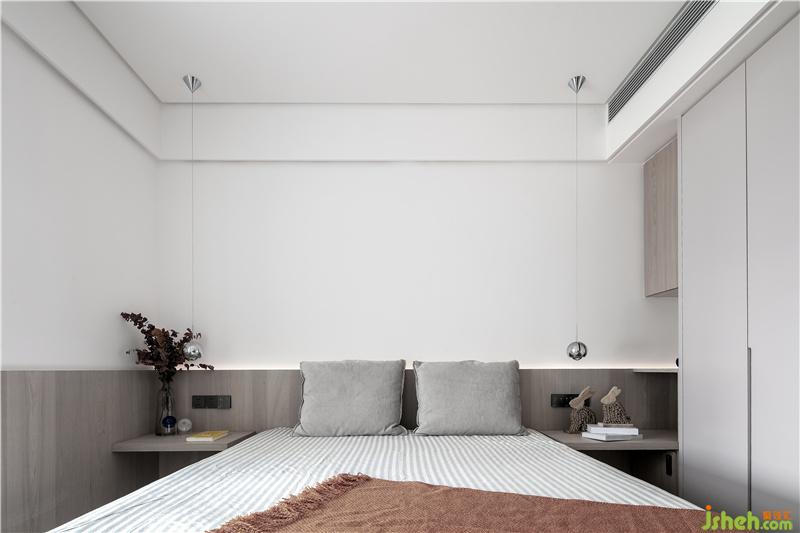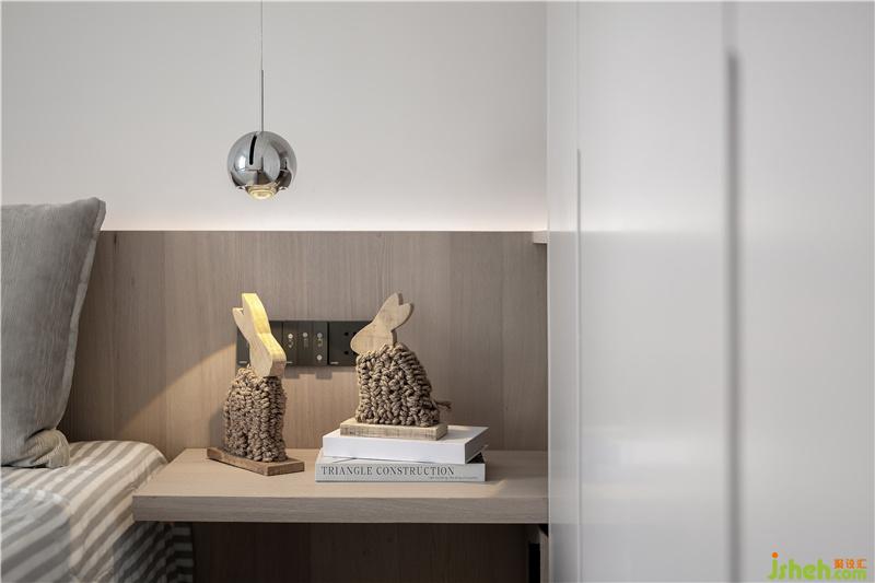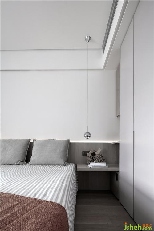床頭處延伸到地柜室內(nèi)設(shè)計(jì)師也做了一體處理,減少了成品柜體的衛(wèi)生死角,也讓整個(gè)空間的效果呈現(xiàn)更加整潔。