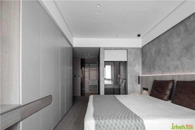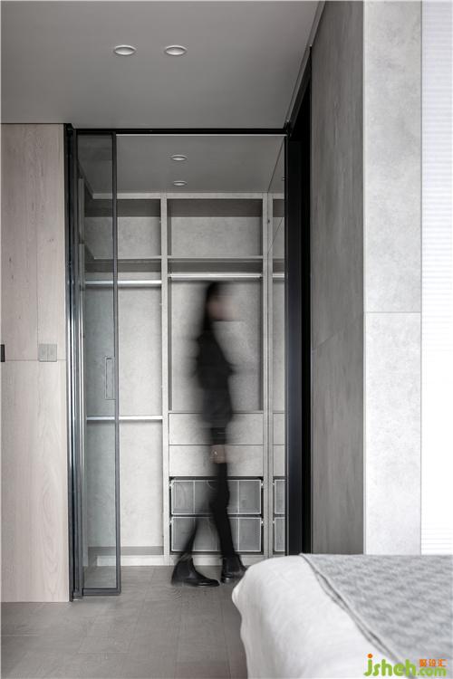 由于業(yè)主的儲物習(xí)慣,衣柜的布局上也特殊做過設(shè)計(jì),室內(nèi)設(shè)計(jì)師將整個(gè)衣服的掛放區(qū)做了懸掛處理。而小件收納則做了地柜,中間做了抽屜,和梳妝臺延伸而在視覺上拉長空間。晚上睡覺臨時(shí)方便放取衣物,在吊柜底部增加了柔光內(nèi)嵌燈帶。