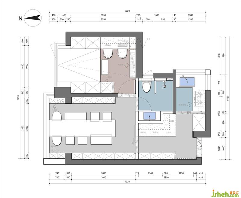 入戶有個全身鏡,替代了傳統(tǒng)衣柜里的鏡子,拖鞋位在鞋柜底部,中廚延伸出來是西廚的臺面,地柜是電器柜,放置洗衣機、烘干機,烤箱。大部分小戶型沒有晾衣服的條件,烘干機也被越來越多年輕人接受。