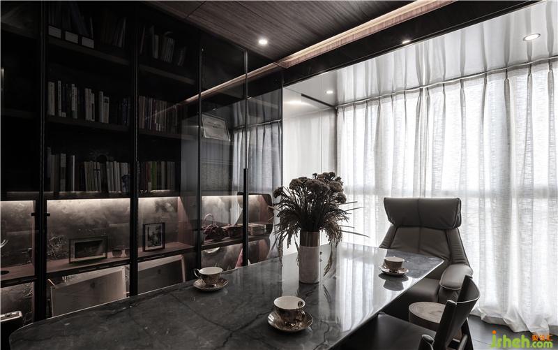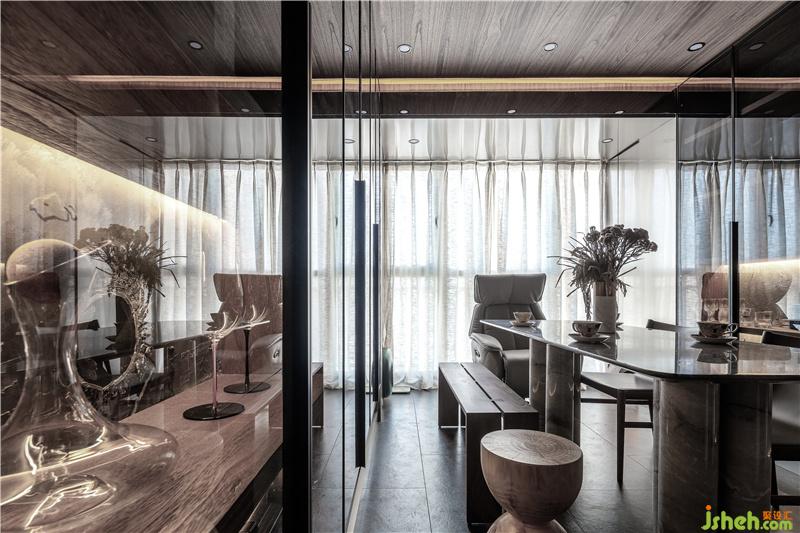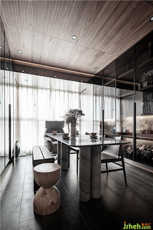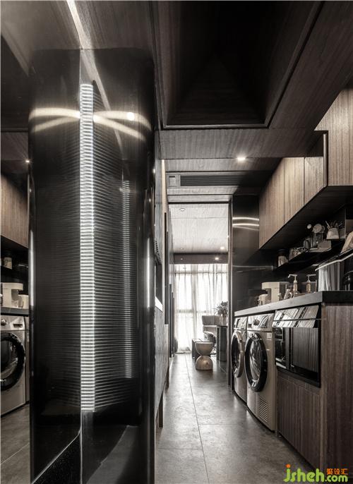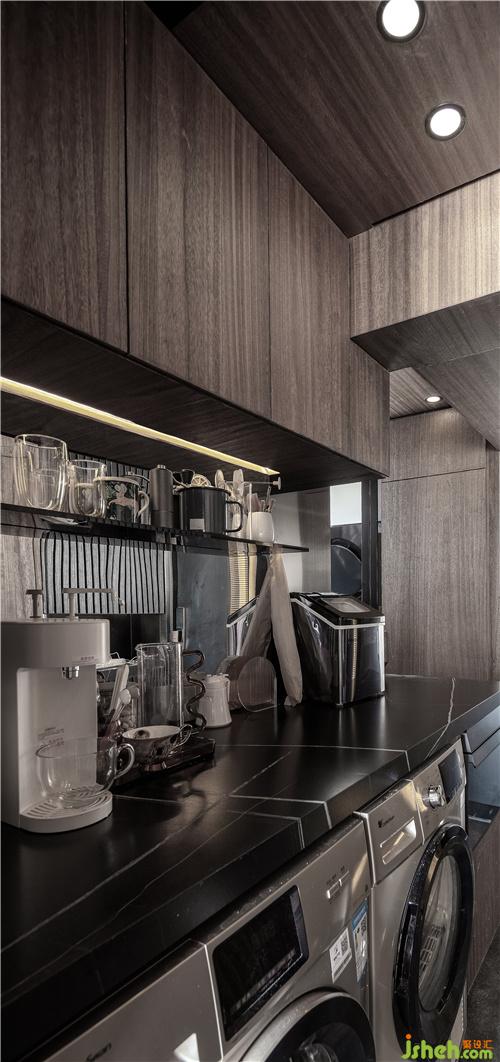 在這個空間里,室內(nèi)設(shè)計師柜門用了黑玻,既可以有視覺的延伸,方便拿取里面的物品,黑玻把物品的飽和度過濾掉,不會顯得雜亂,天花和墻面材質(zhì)是統(tǒng)一的木飾面,不分割空間,更加整體。