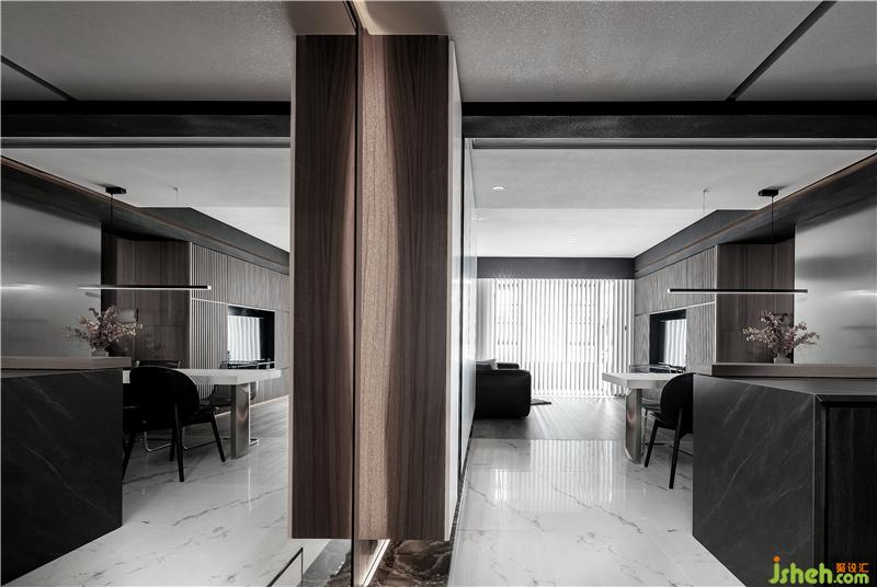 客餐廳以過道為隔,很好的劃分了左右兩個(gè)區(qū)域,過道整面墻以木色為主,讓整體空間看起來不會(huì)太空曠,簡(jiǎn)約又大方