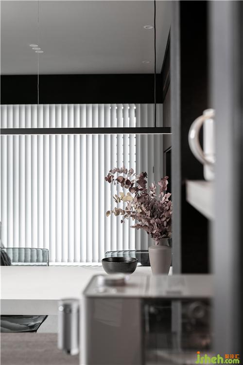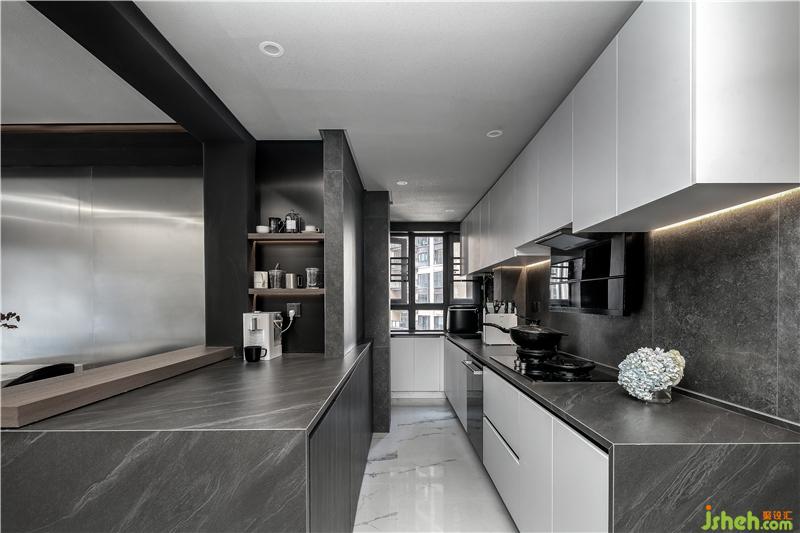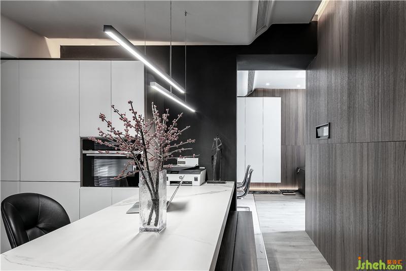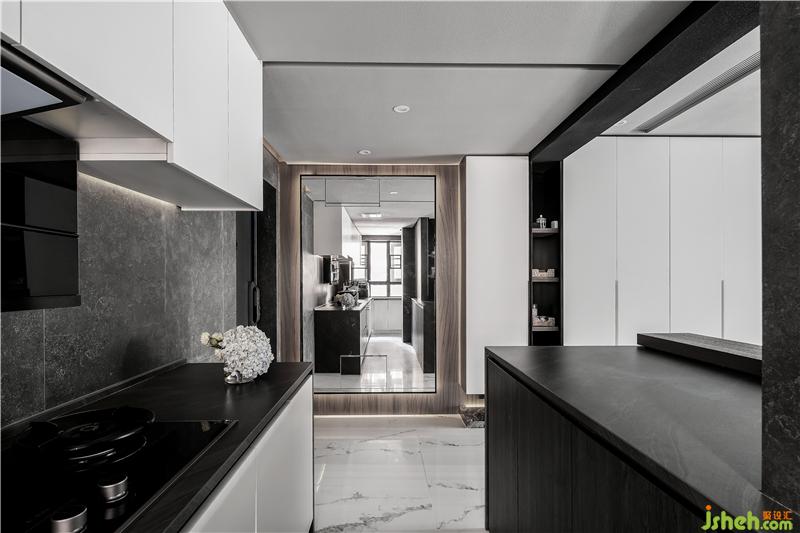 入戶右邊為原先的封閉式廚房,設(shè)計(jì)師將廚房設(shè)計(jì)為開放式廚房,在廚房是簡(jiǎn)約大氣的黑白系,帶來更強(qiáng)大的明亮感和開闊感。臺(tái)面為黑色的大理石,櫥柜為啞光白色烤漆柜門,一黑一白,對(duì)比呼應(yīng)。在玄關(guān)與廚房的天花間設(shè)計(jì)了一段軌道,用以區(qū)分兩個(gè)空間。
