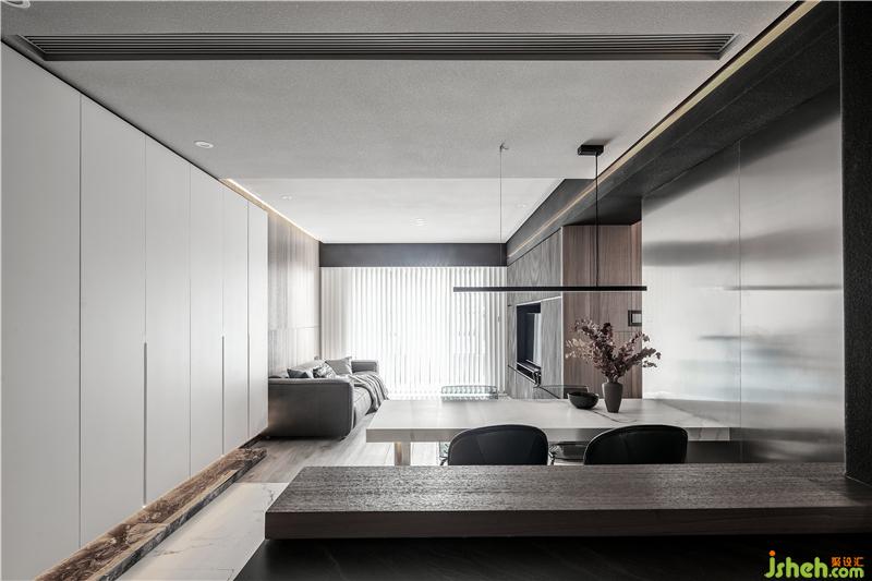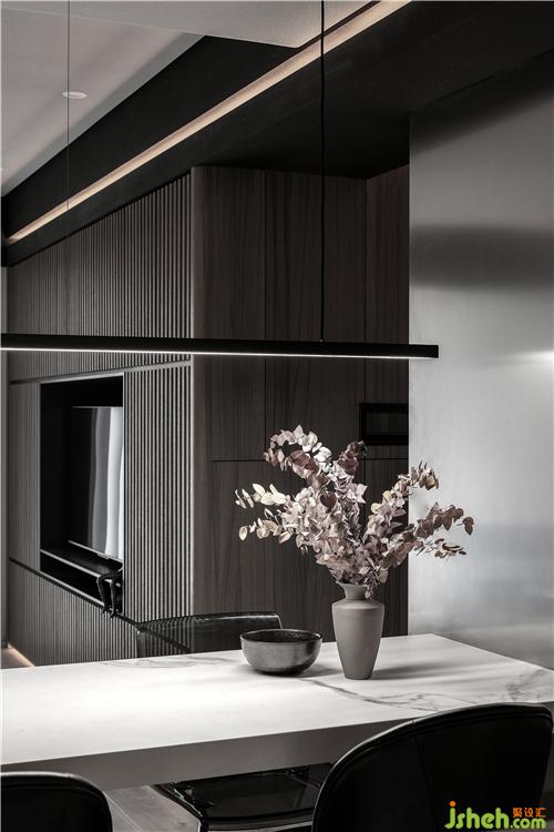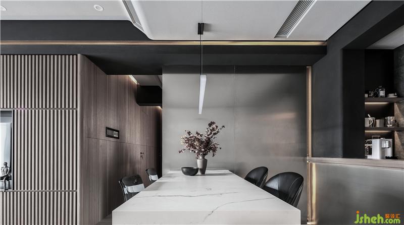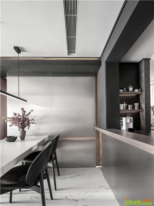 相鄰的開放式輕吧區(qū),以不銹鋼確立分界,輔以木色的臺(tái)面。餐廳的墻面整面是不銹鋼,在與吧臺(tái)區(qū)的墻面處藏有燈帶。餐桌是白色大理石,桌腿是不銹鋼造型,這兩旁是一對(duì)皮子靠椅和一對(duì)灰色透明亞克力的椅子。