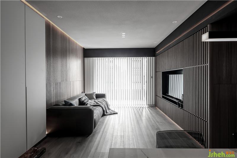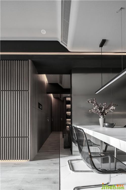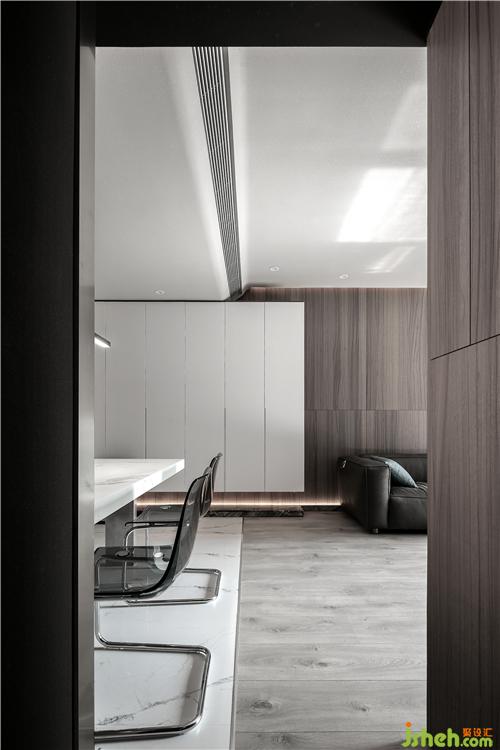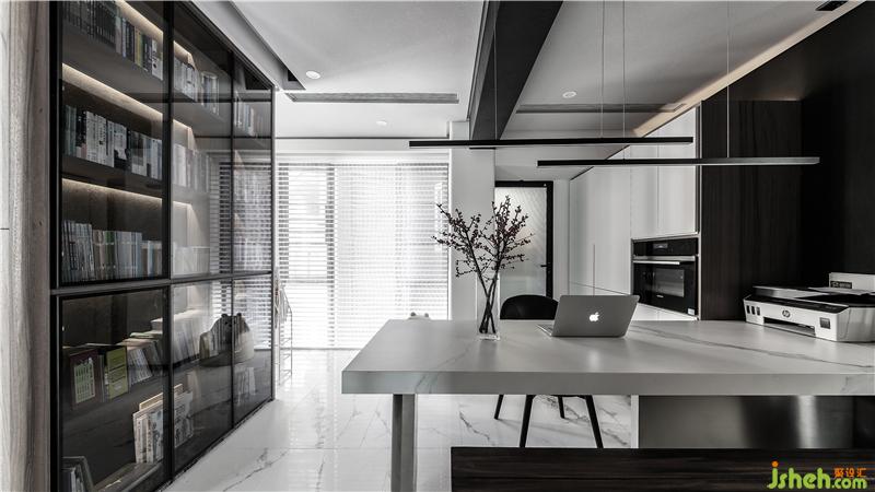 多功能室的書柜運(yùn)用玻璃推拉門,百葉窗讓充足采光穿透到客餐廳。整個(gè)空間采用黑白+木色為色調(diào),營(yíng)造出最干凈溫和的視覺(jué)觀感。半開(kāi)放式的多功能室是對(duì)空間“關(guān)系”的思考,互通性與私密性共生。黑色的線條流動(dòng)其中,用線條構(gòu)建簡(jiǎn)潔的利落感。