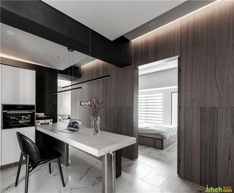 多功能區(qū)的桌子與餐廳相同,大理石臺(tái)面與不銹鋼交相輝映,為空間注入了一絲硬朗。