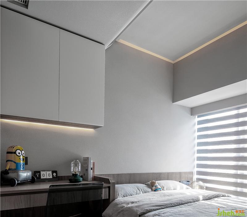 次臥的收納空間做得也是非常充足的。白色烤漆吊柜與白色墻面交織成一幅線條感強(qiáng)且立體的畫面,深圳裝修設(shè)計(jì)視覺(jué)上更簡(jiǎn)潔、統(tǒng)一。