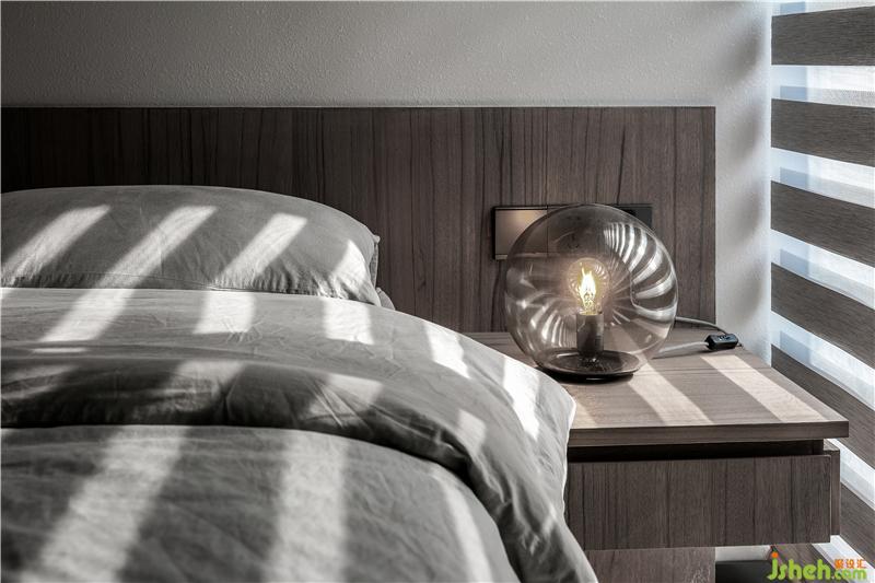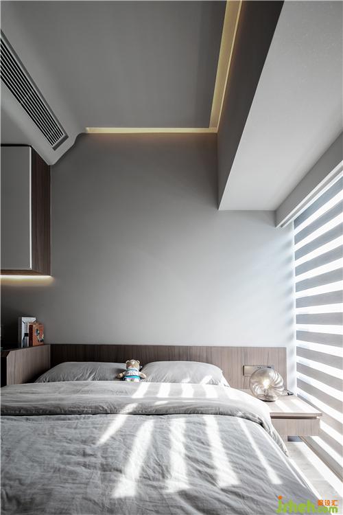 次臥部分墻面選用了淺灰色調(diào)的漆面,避免了全白墻面的單調(diào),同時(shí)與床頭融為一體,有種由外而內(nèi)的延伸感。