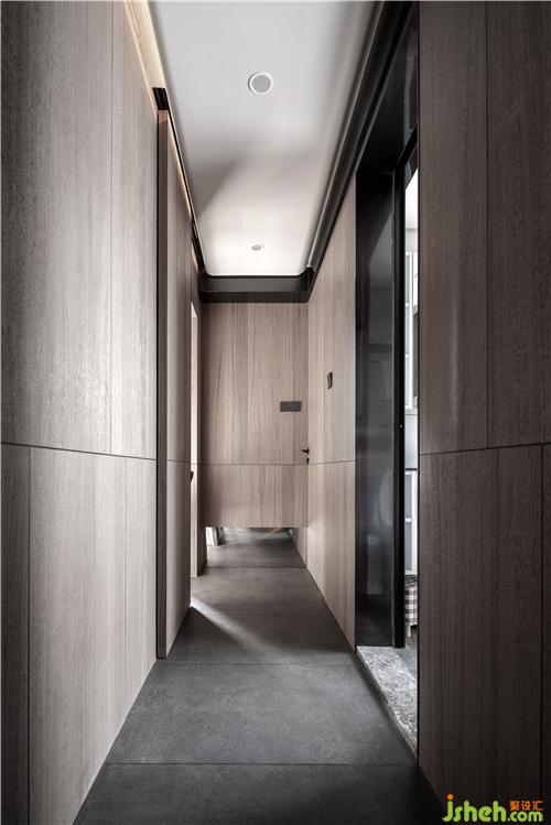 從過道看向兒童房盡頭,天花的白和墻面的木飾面,灰調(diào)的地磚中和,自然的色彩行走其中,明快通透,走道盡頭木飾面拼接了鏡子,引發(fā)遐想,延伸空間視覺性。