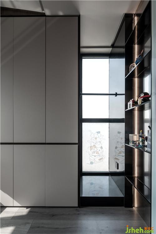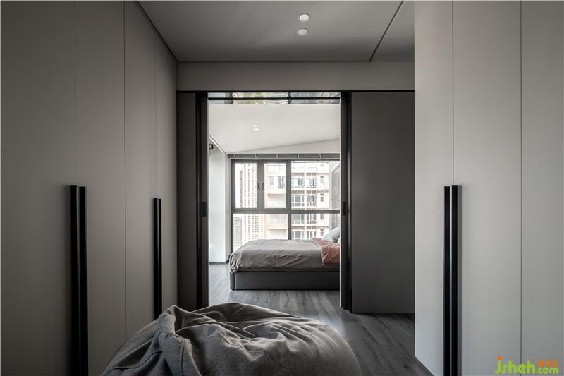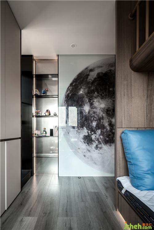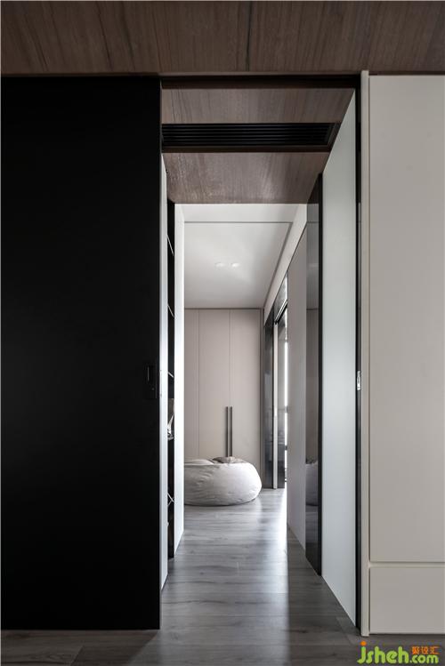 臥室是吊軌式的,這種工藝需要在前期天花設(shè)計時預(yù)留軌道槽,深圳裝修設(shè)計地面不用安裝軌道,解決了傳統(tǒng)推拉門軌道清潔的痛點(diǎn)。