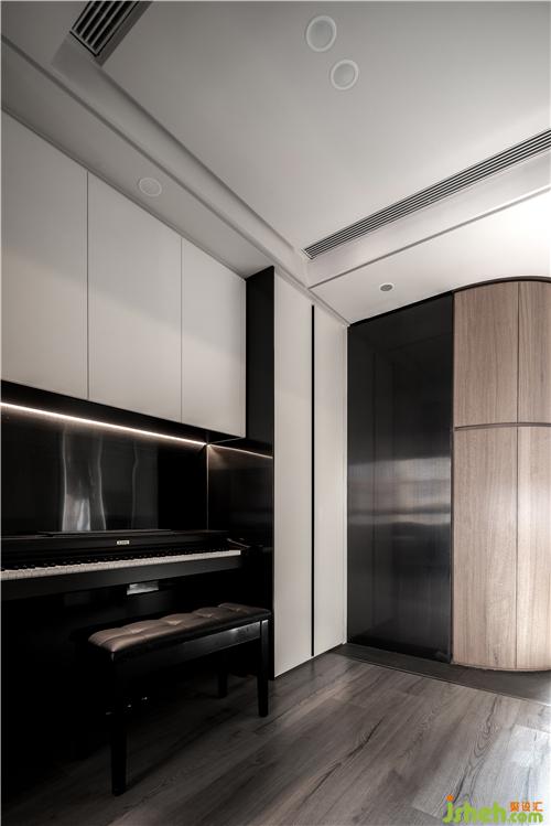 鞋柜中間做了個巧妙的設(shè)計,把鋼琴嵌入其中,做到了和客廳玩??措娨暬蛘邐蕵返募胰嘶ゲ淮驍_。