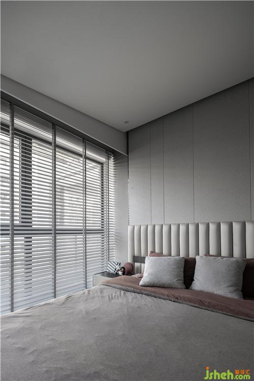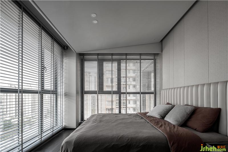 臥室兩面的落地窗,讓空間通透明亮,同時天花做成謝頂,延伸的線條,放大空間的視覺感。