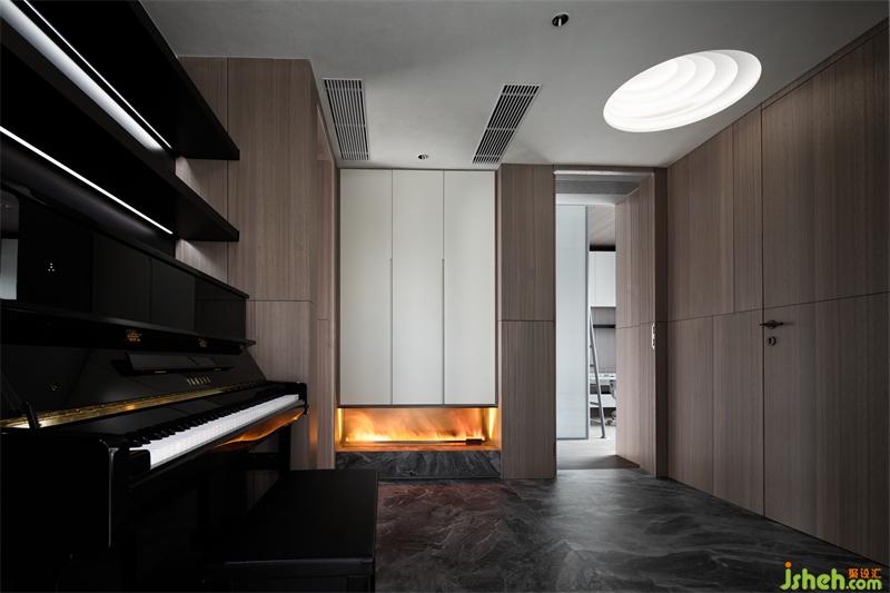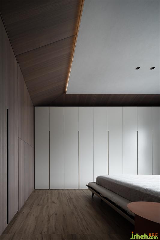 光線由天花暗藏處傾瀉至斜面木飾面而出