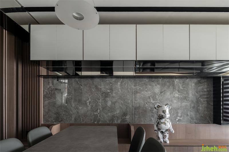保持餐廳的整潔清爽;色彩上同樣采用了烤漆的白色烤漆吊柜搭配墻面大理石