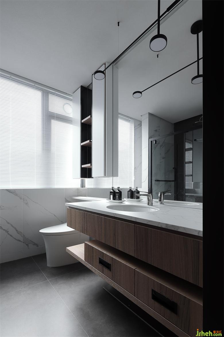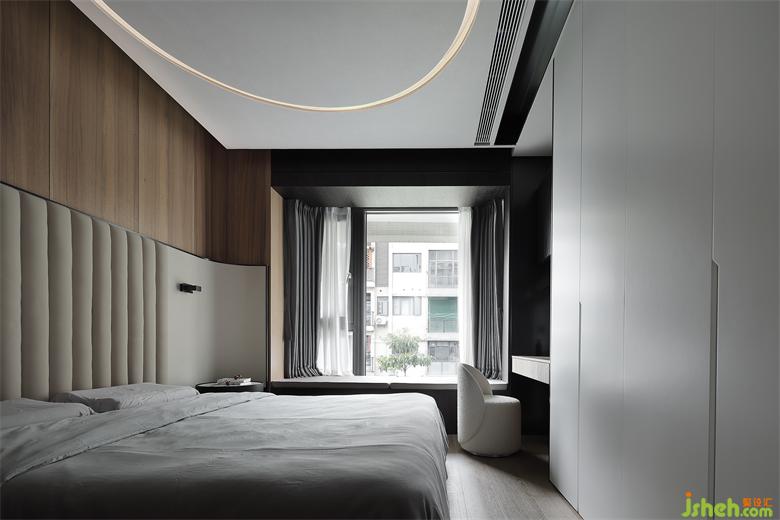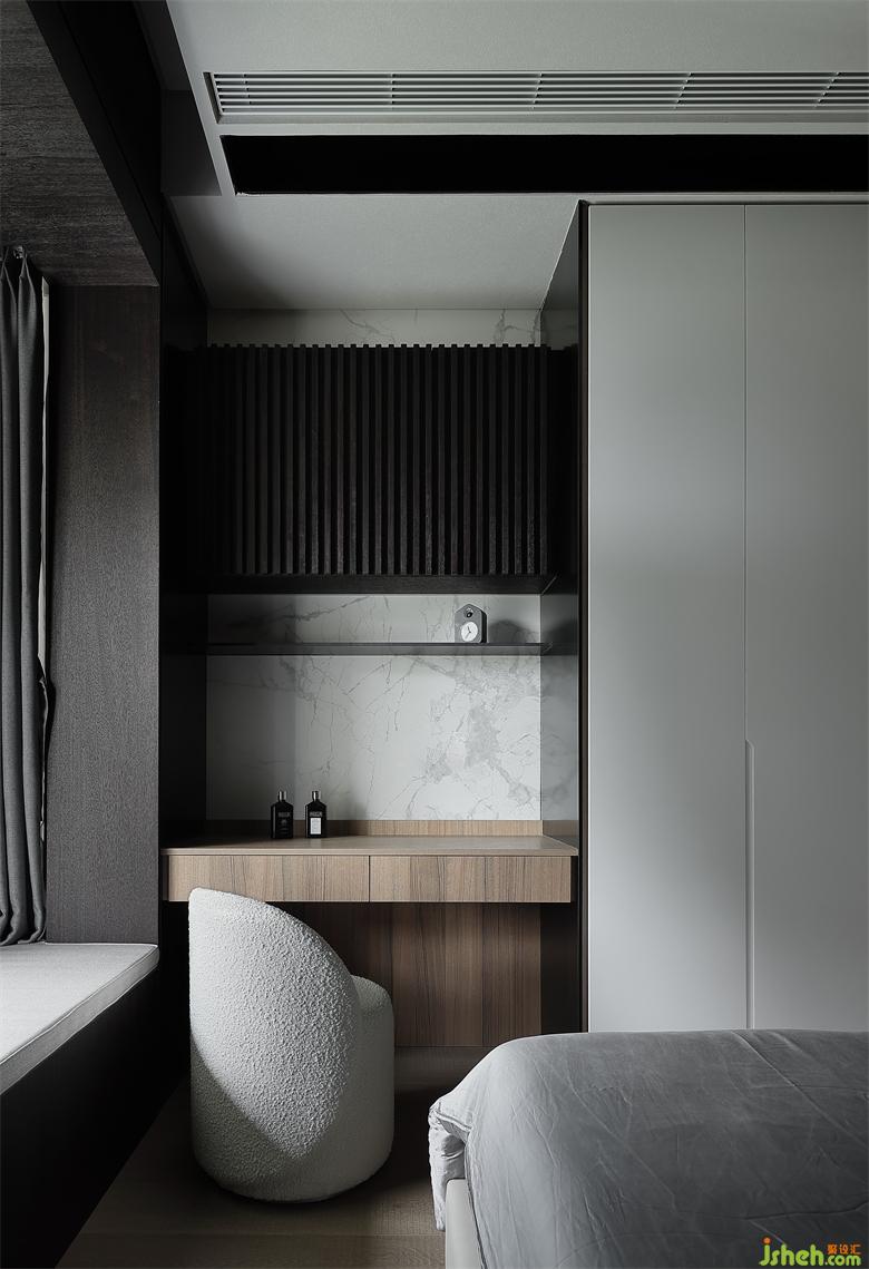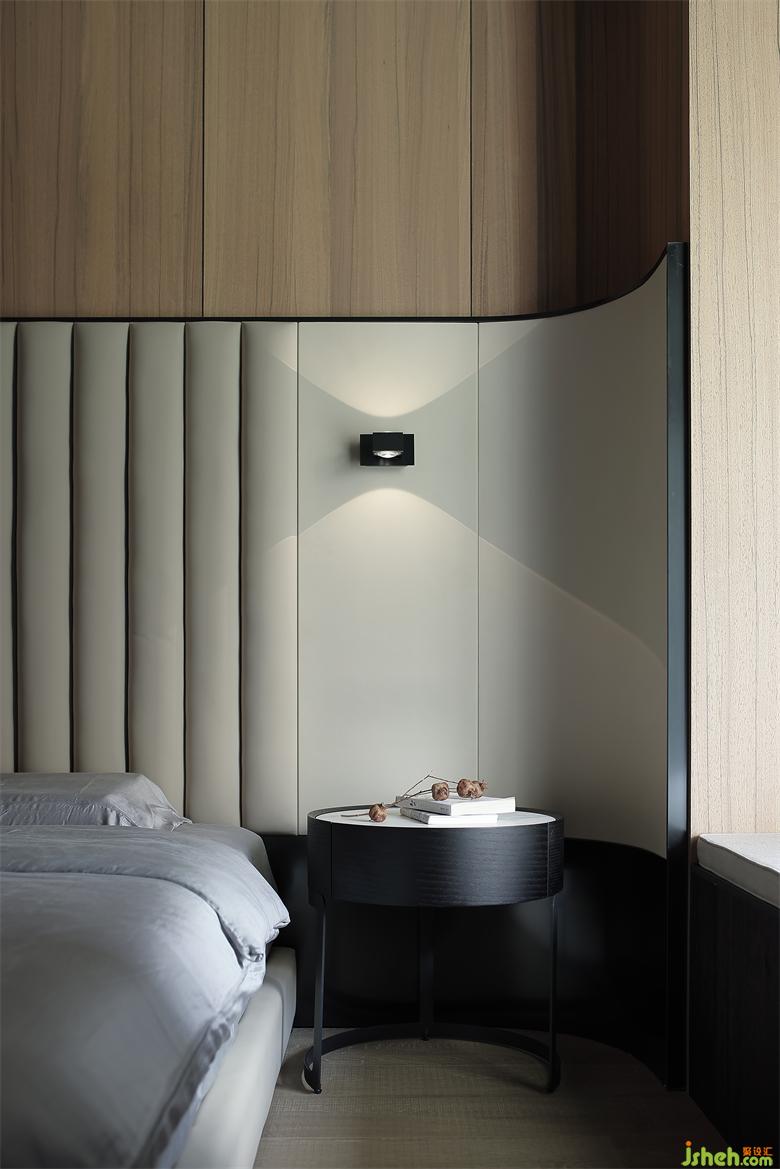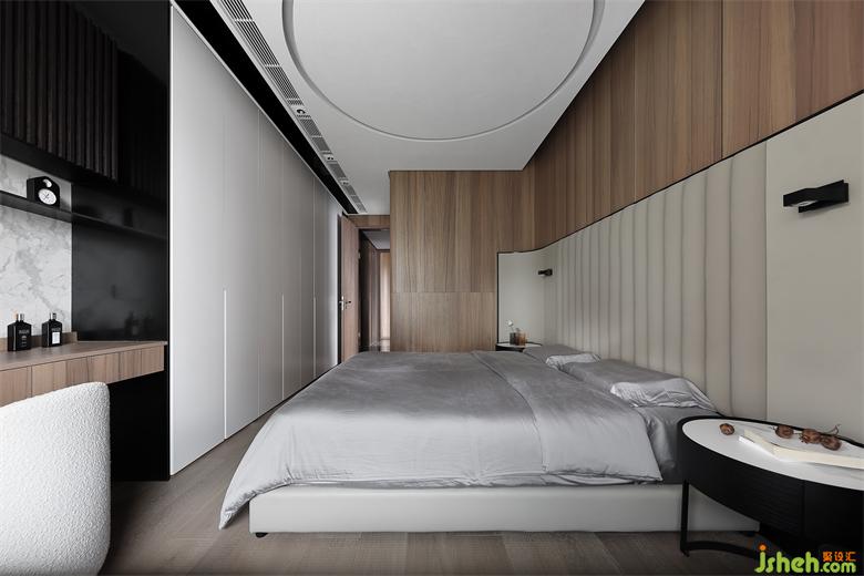 主人房的設(shè)計,在自然之境的主題下,天花的圓似蒼穹,點線面的勾勒組合將空間功能簡單的表達,有溫度的質(zhì)感的軟裝單品,點到即止,時尚與質(zhì)感的交融,展示屋主的品味喜好,金屬、木飾面和房屋中大面積白色形成碰撞和交匯,給房間增添了自然的生命力的同時卻又各自成景。木子仁設(shè)計主臥與主衛(wèi)形成套房設(shè)計,隱藏門和木飾面墻體連成一體,功能各司其職卻又和諧共存,豎木紋的懸空柜子和過道設(shè)計手法一致,光深淺交織交織出和諧的畫面。