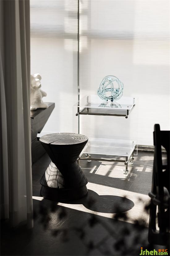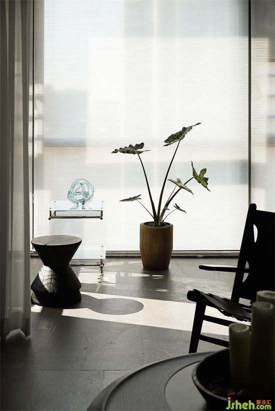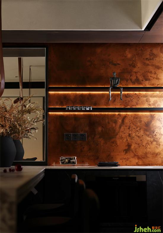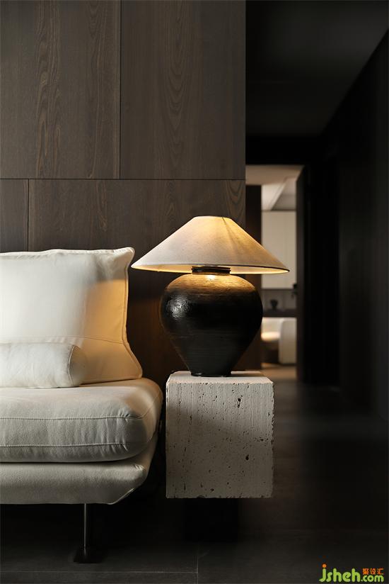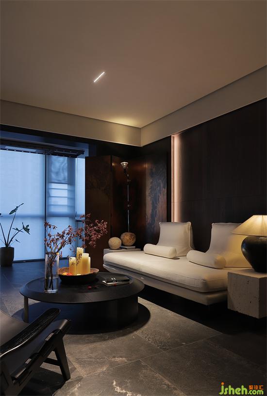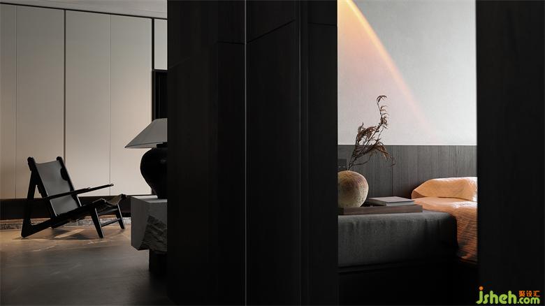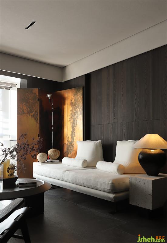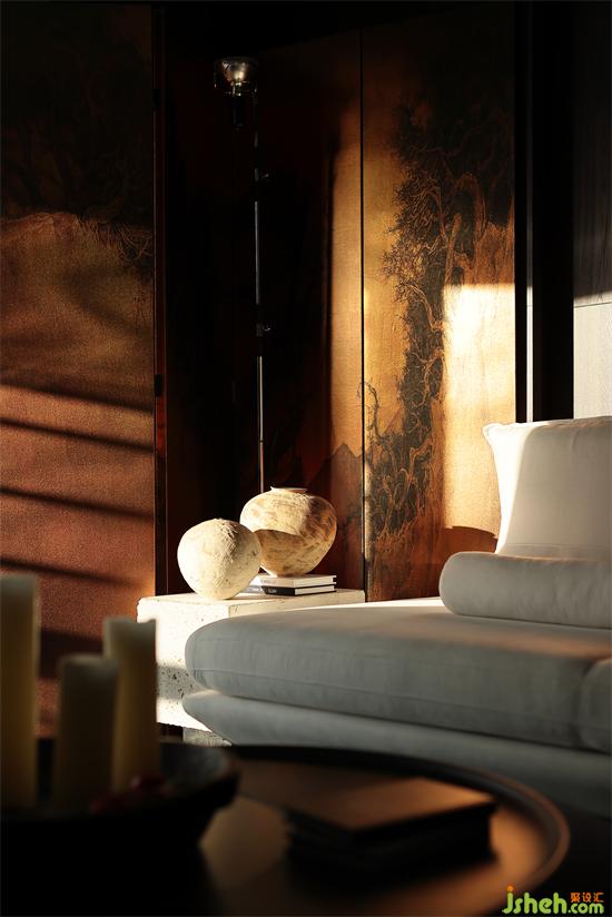 沙發(fā)背景墻是暗色的木,下午溫暖的陽光透過窗戶,洋洋灑灑,讓墻面有了溫和的質(zhì)地。水墨畫的屏風(fēng)經(jīng)夕陽的余暉有了不一樣的感官平衡,在整個暗色空間有些許的暖。家裝設(shè)計賦予了城市冷漠表象下溫柔內(nèi)心的完美詮釋。