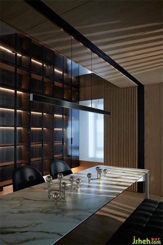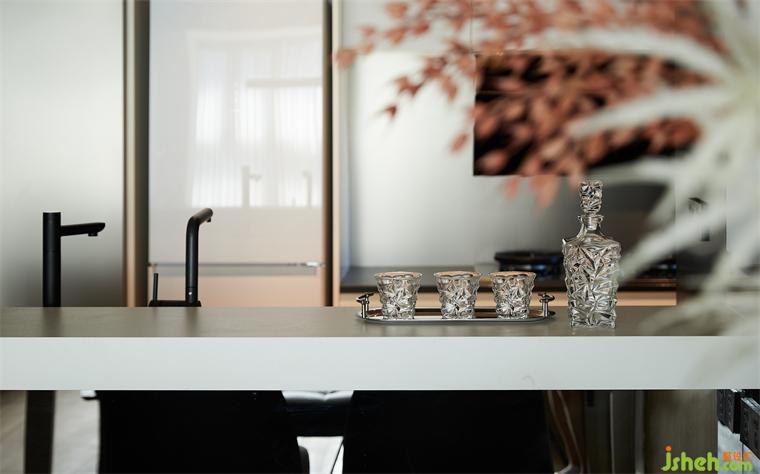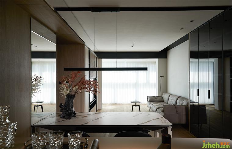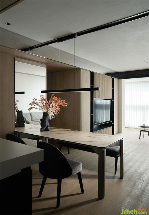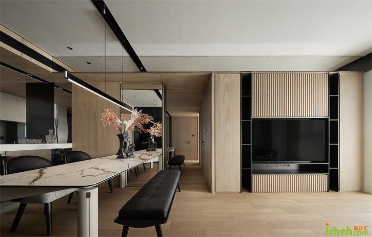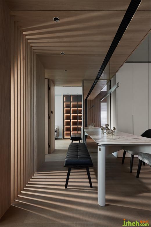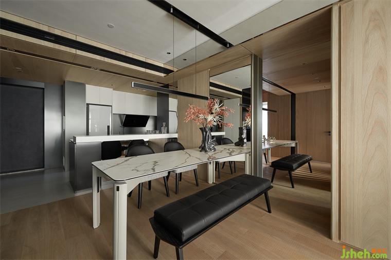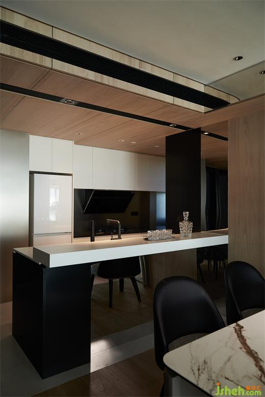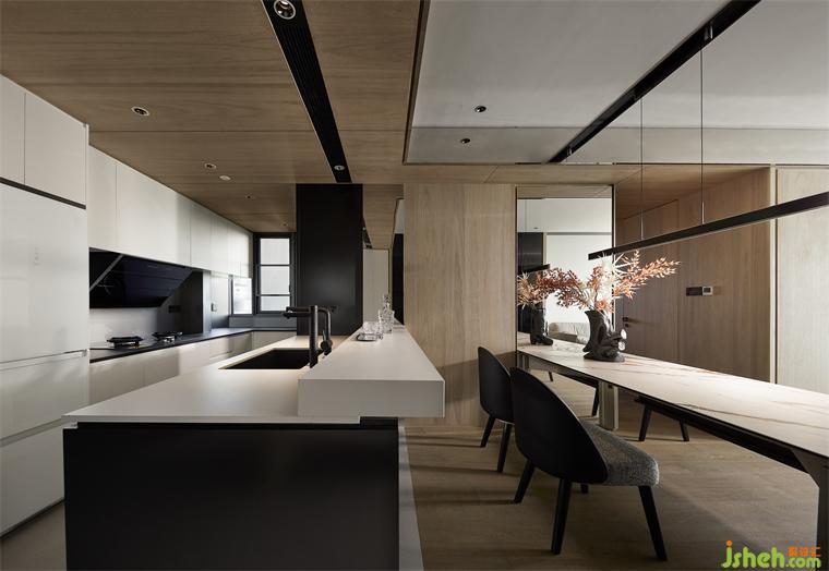 島臺與長桌相映成輝,輔助使用者更好的體驗感,白色巖板搭配原木桌腿,如涓涓細(xì)流沖向堅硬的巖石,是融合下的材料肌理之美。