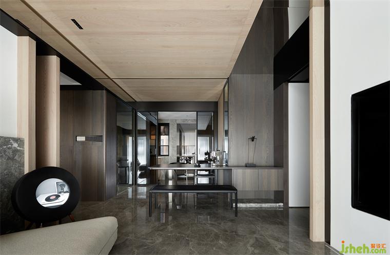 基于居住者的實際需求和生活習(xí)慣,通過先圍繞房屋進行去中心化再聚合空間功能的手法,裝修設(shè)計讓空間的廣度、深度、功能、形式有了新的定義?!叭ブ行幕钡氖址▽⒃緜鹘y(tǒng)的客廳構(gòu)建出足夠豐富的空間層次,不再只圍繞著電視為家庭休閑的核心區(qū)域,而是改造為閱讀區(qū)、客餐區(qū)、休閑區(qū)的整體空間,建立了自由的視覺聯(lián)系與互動,加強了家人之間的情感。聚合空間將空間不再獨立去進行硬性功能要求,制造彈性空間,互動性功能性增強。