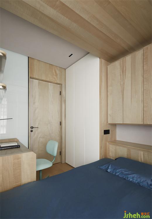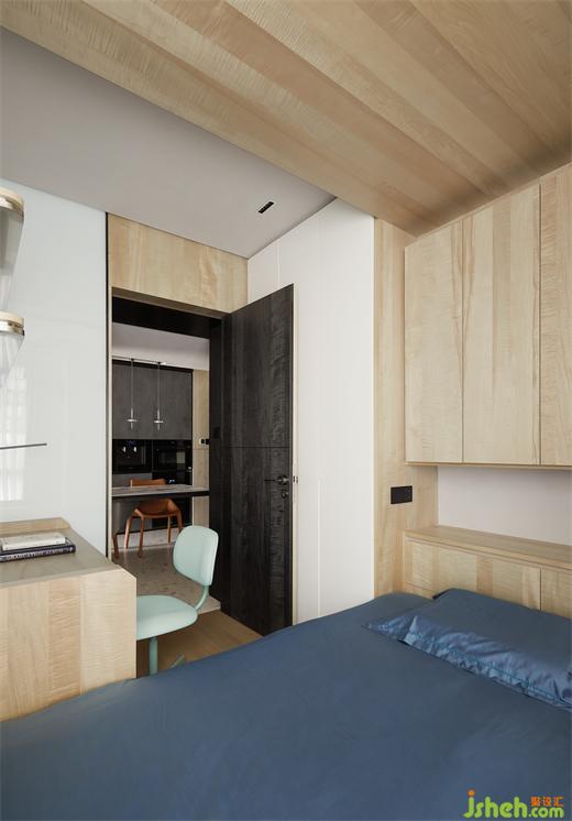 次臥大面積的木作、白色的肌理漆及磁吸玻璃和烤漆的使用,呈現(xiàn)出統(tǒng)一的克制審美,設計師支持柔和、舒緩的色調和紋理,而不是浮華和視覺混亂。