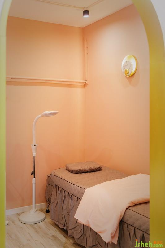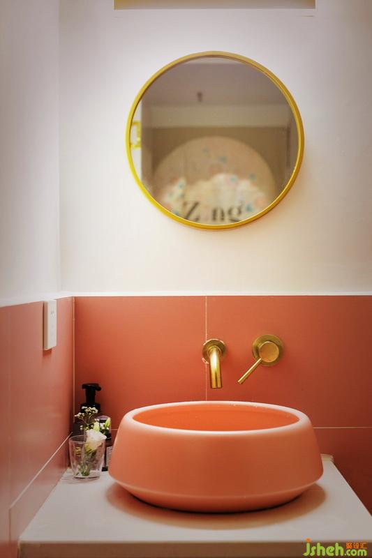 室內(nèi)采用圓形、半圓、凹陷和凸起等幾和形細(xì)節(jié),幾何形結(jié)構(gòu)為空間增加了層次感。顏色當(dāng)然是少女色啦,床的深棕色與之搭配,并沒(méi)有感覺(jué)到暗沉,反而是一直沉穩(wěn)舒適的感覺(jué)。衛(wèi)生間采用臺(tái)上盆,金屬質(zhì)感的水龍頭與橘粉色的臺(tái)盆搭配,制造少女情懷。