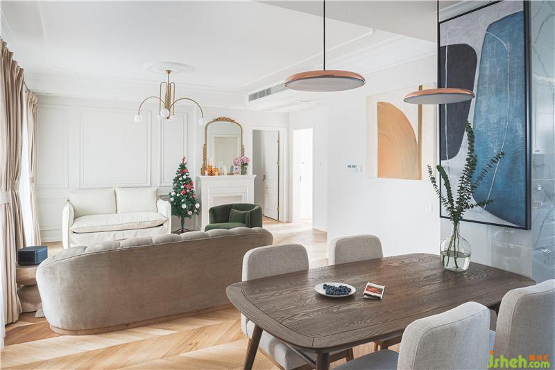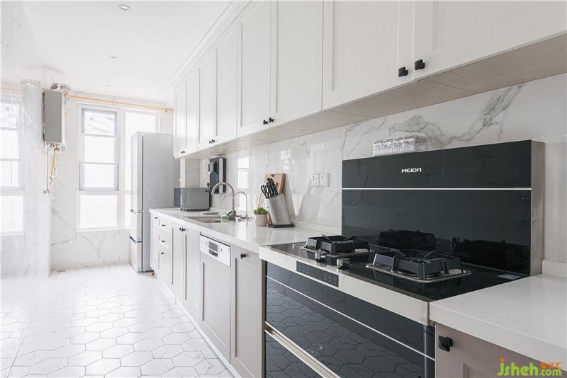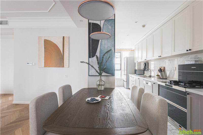 女主人很少下廚,我們將封閉式廚房改造成開(kāi)放式廚房,一方面是為了打通與客廳之間的連接,讓整個(gè)空間顯得更大,另一方面由于客廳的空間狹小,加上餐廳會(huì)尤為狹窄,所以設(shè)計(jì)師將墻打掉,把餐桌放于客廳與廚房的交界處,并且用六邊形小白磚與木地板連接,顯得空間更有層次感為其一,其二,開(kāi)放式的布局可以一邊做菜一邊和家人朋友聊天,和大家分享原材料是怎么被加工成美食的這個(gè)過(guò)程,這非常重要。