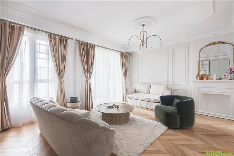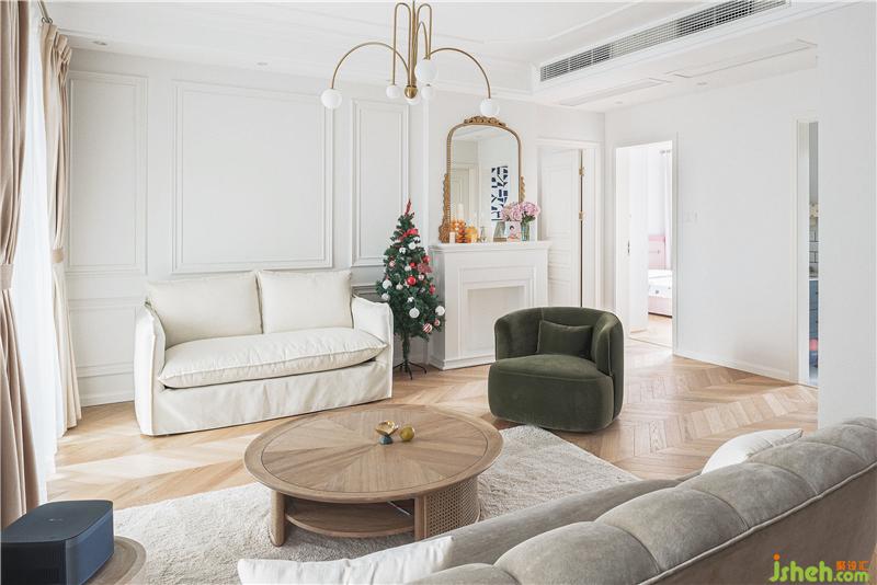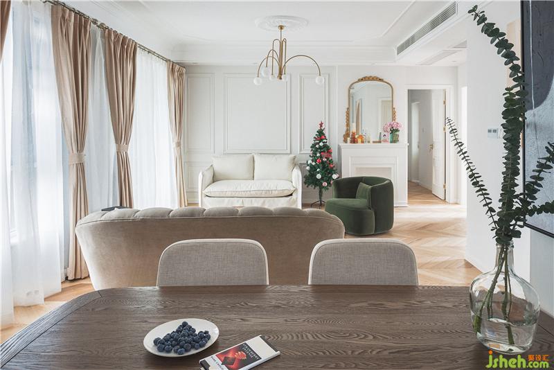 入戶后,客廳餐廳以及廚房的部分一攬入云,整體擴(kuò)大了視野,由于業(yè)主很喜歡壁爐,所以設(shè)計(jì)師在考慮了壁爐之后,便沒(méi)有增加電視墻,考慮后期會(huì)加入投影儀,于是設(shè)計(jì)師將壁爐放于右側(cè),貼墻設(shè)計(jì)。為避免旁邊顯得空落,設(shè)計(jì)師在臨壁爐旁,放置雙人沙發(fā),相互呼應(yīng)。家具尺寸選的相對(duì)袖珍三人沙發(fā)、雙人沙發(fā)和單人沙發(fā)的錯(cuò)落搭配,加上諾大的雙排大窗,讓整個(gè)空間視覺(jué)在原有的基礎(chǔ)上擴(kuò)大化。