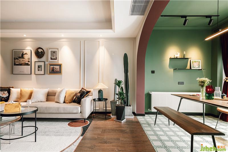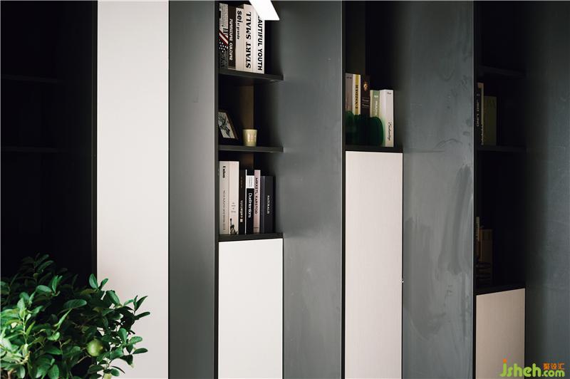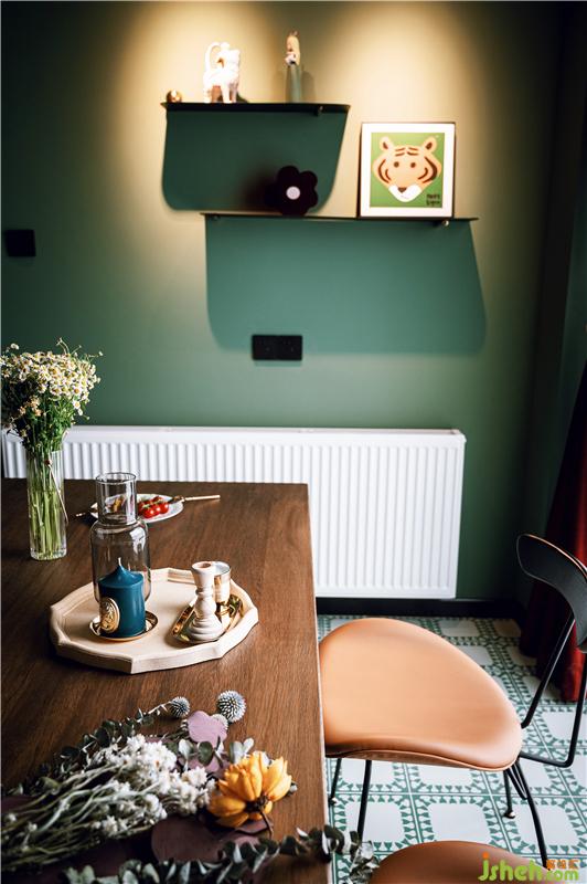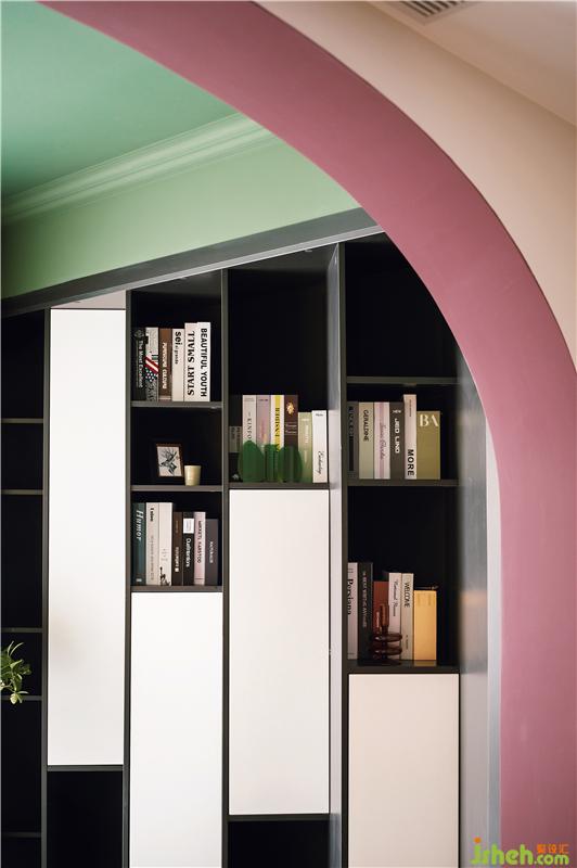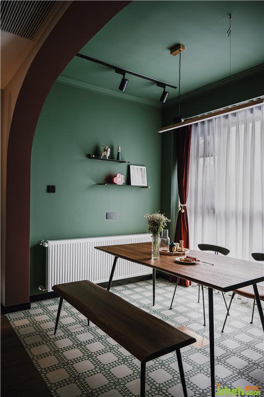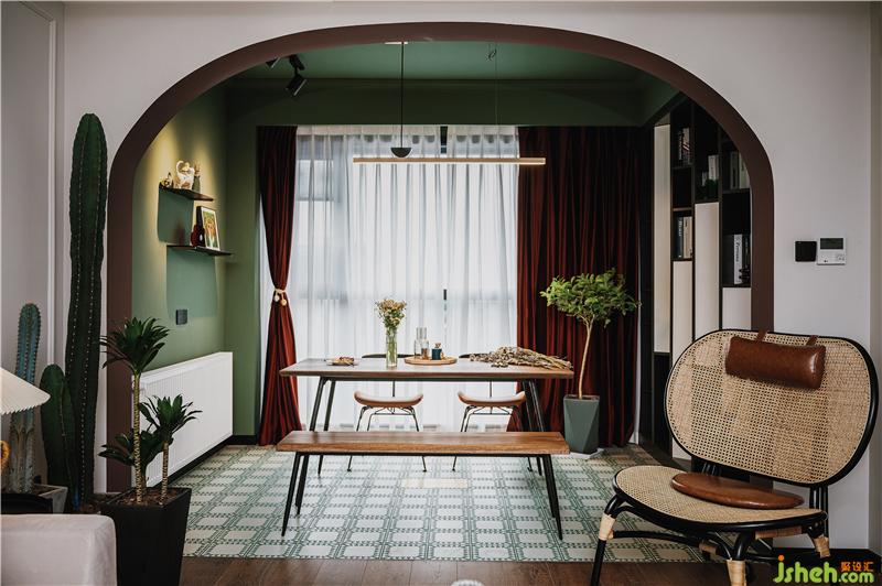 為了烘托花園陽臺為一個獨立、重復古感的區(qū)域,線條流暢的棗紅色圓弧門洞,墻面與頂面都采用墨綠色,給人一種視覺沖擊感。在此中央放置木質(zhì)長桌,同時滿足了辦公和聚餐的需求。陽臺斜面書柜面向客廳中心區(qū)域,呈半開放式設(shè)計,利于清潔,也收納方便。裝修設(shè)計