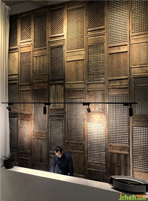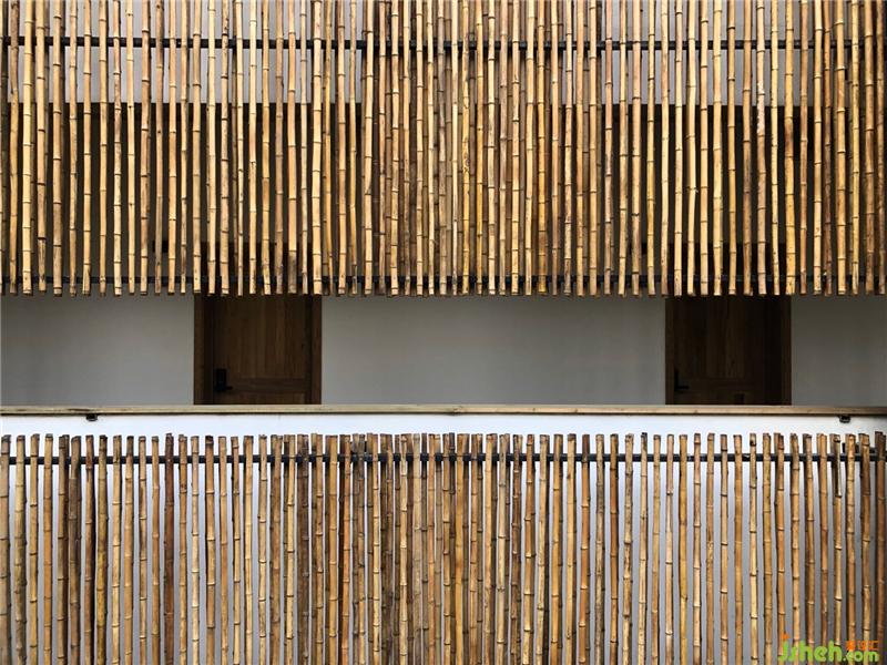 竹竿貼立面裝配形成影簾。由竹竿構(gòu)成豎直線條,有意思的是反過來透過這些豎直線條之間的開口可以看到外部的自然風景。
