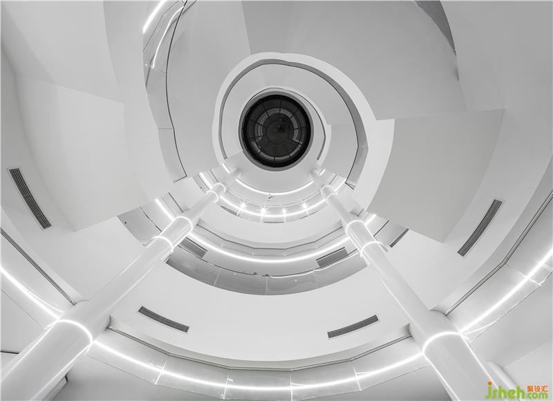 得益于建筑中庭頂部的采光玻璃,將頂部的自然采光最大限度的引入到各個樓層空間