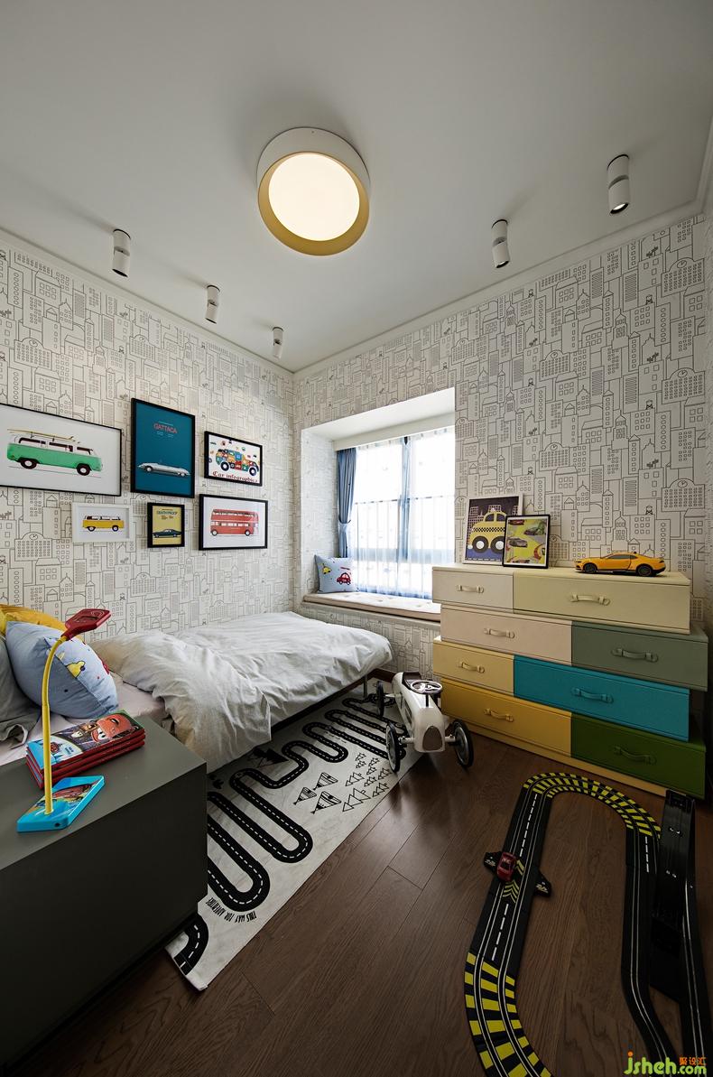 城市主題墻紙搭配車元素掛畫組合,賽道地毯、抱枕、臺燈、車模擺件等,豐富的空間層次感且童趣十足完美地演繹了汽車主題兒童房,設計同時留出最大的活動空間,讓孩子可以在此盡情的玩耍。
