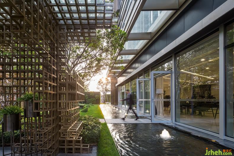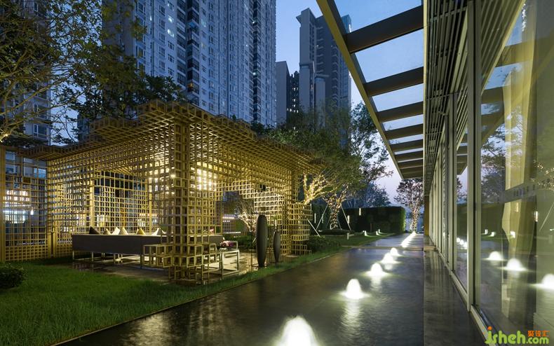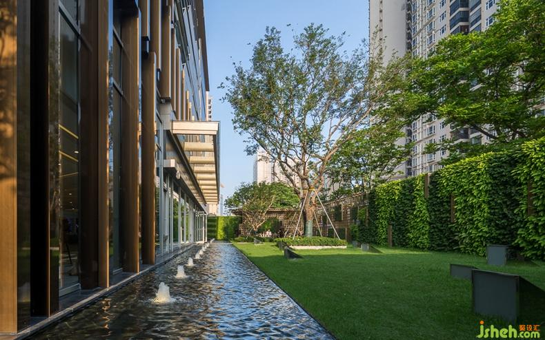 連綿的地景,搭配輪廓分明的音樂草地?zé)?,設(shè)計(jì)公司通過這些簡單而微妙的關(guān)聯(lián),與整體設(shè)計(jì)元素相呼應(yīng)。綠植墻的設(shè)計(jì)讓綠在立面上得以延續(xù),塑造出了空間的多維層次感。