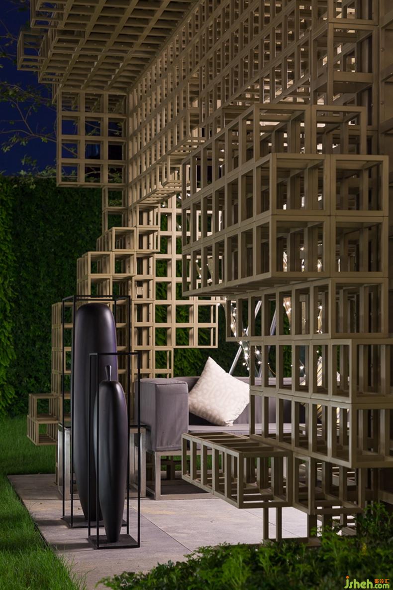 大小各異的水晶光斑體塊圍合成一個(gè)獨(dú)特的景觀亭,同時(shí)也可作為展示空間使用。設(shè)計(jì)公司體塊組合、連續(xù)、重疊的變化,形成舒適均衡的視覺效果。
