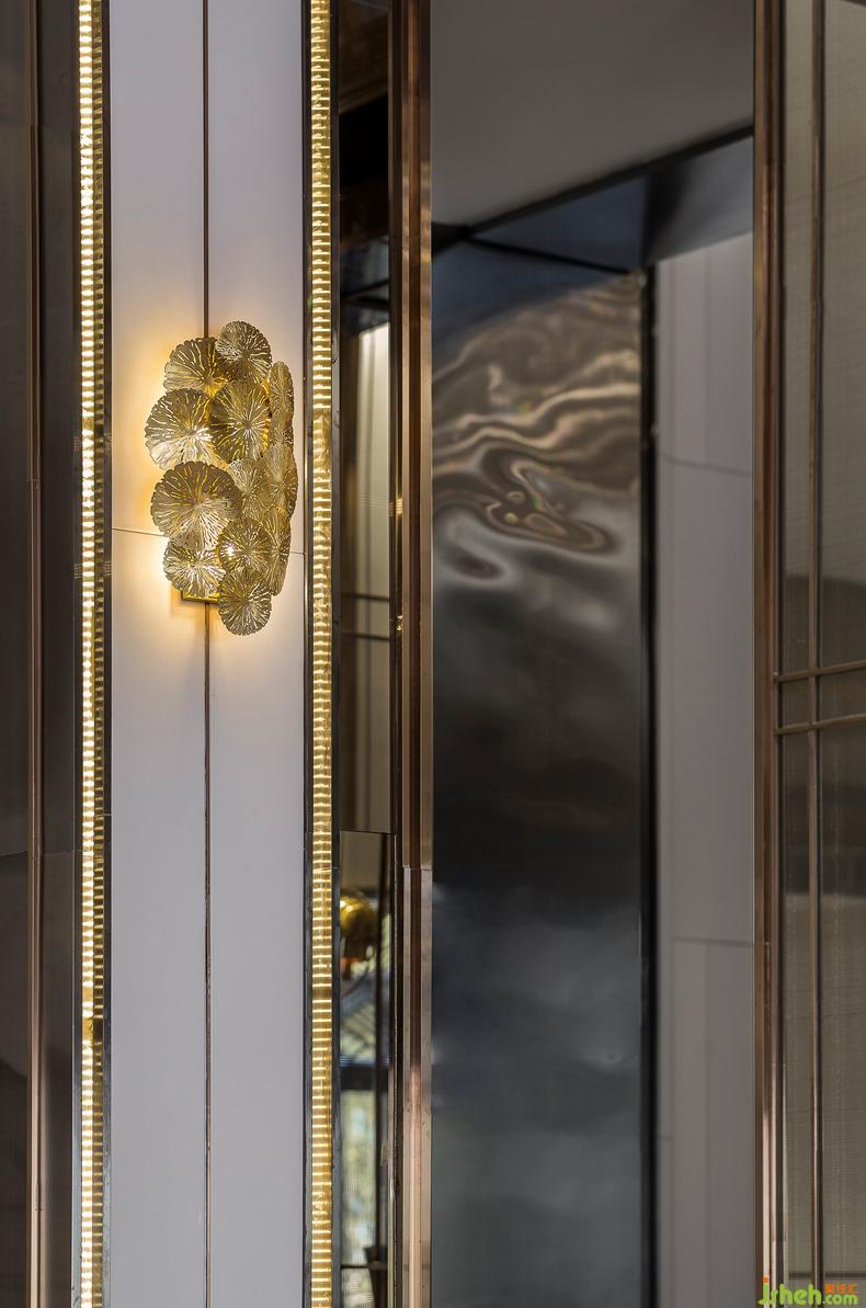 富有質(zhì)感的金屬藝術(shù)吊燈,與天然石材的運用,彰顯空間適度的奢華感.