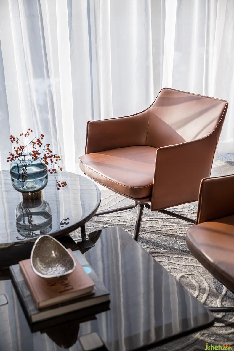 家具造型呼應(yīng)硬裝的幾何線條感,純白紗幔、優(yōu)質(zhì)皮革沙發(fā)、大理石金屬茶幾,與橘色單椅搭配,呈現(xiàn)一種堅硬與柔軟并存,光潔與沉穩(wěn)并呈的特殊質(zhì)感,彰顯了空間并不張揚(yáng)的奢裝理念.室內(nèi)設(shè)計師