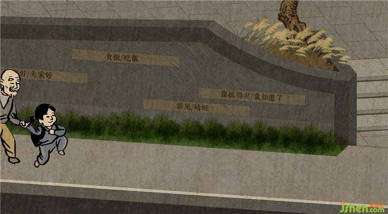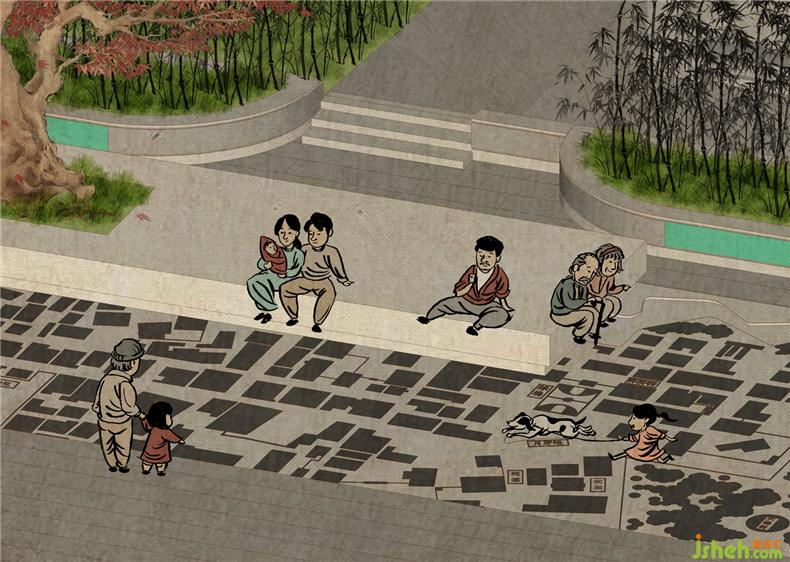 The village memory display area simplifies the texture of the old West Village to the format of base drawing to form a pavement with the characteristics of engraving the village memory, creating a space recognition and continuing the original memory of the place. In the centre of leisure stools, a large-leaf banyan tree is planted to form the cohesiveness for the space while it shades for pedestrians.