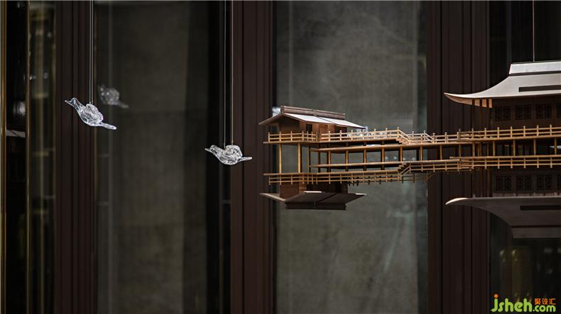 一處建筑的表現張力往往從公共空間開始,黑灰色調襯托著鎏金色度的優(yōu)雅,方正開闊的空間秩序鋪陳著儒雅的敘事邏輯,移步亦趨的旱景作品鋪設出古韻的藏墨畫卷,讓空間遐帶一隅夢回之境,對話中式美學的謐靜。