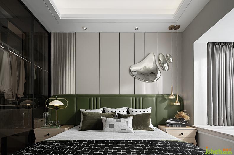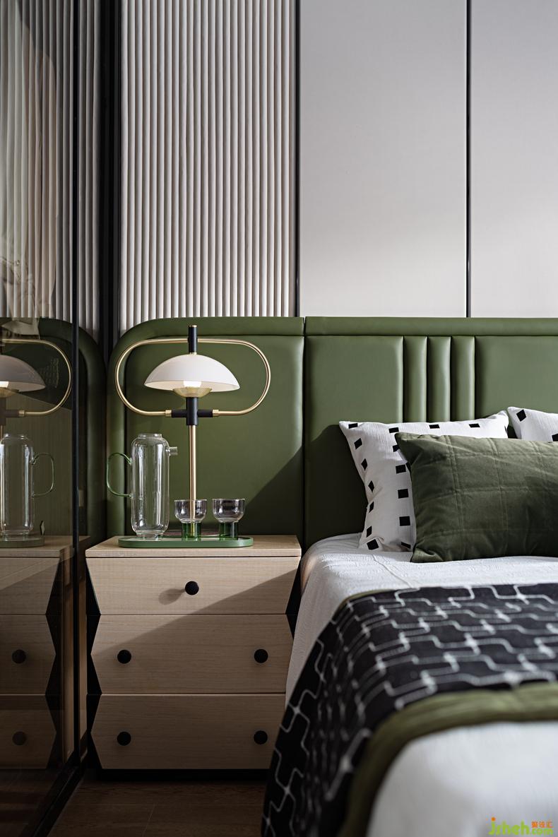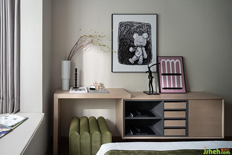進(jìn)入主臥印入眼簾的即是它通透的格局和質(zhì)感的肌理,星云綠的色彩聚焦搭配著素色拼貼的幾何線條,陽光透過飄窗落入室內(nèi)即有最舒適的關(guān)系色彩,打破時(shí)空的局限,輔以創(chuàng)意感十足的燈具置景和居者熱愛的星際熊潮流作品,生活即是樂趣。