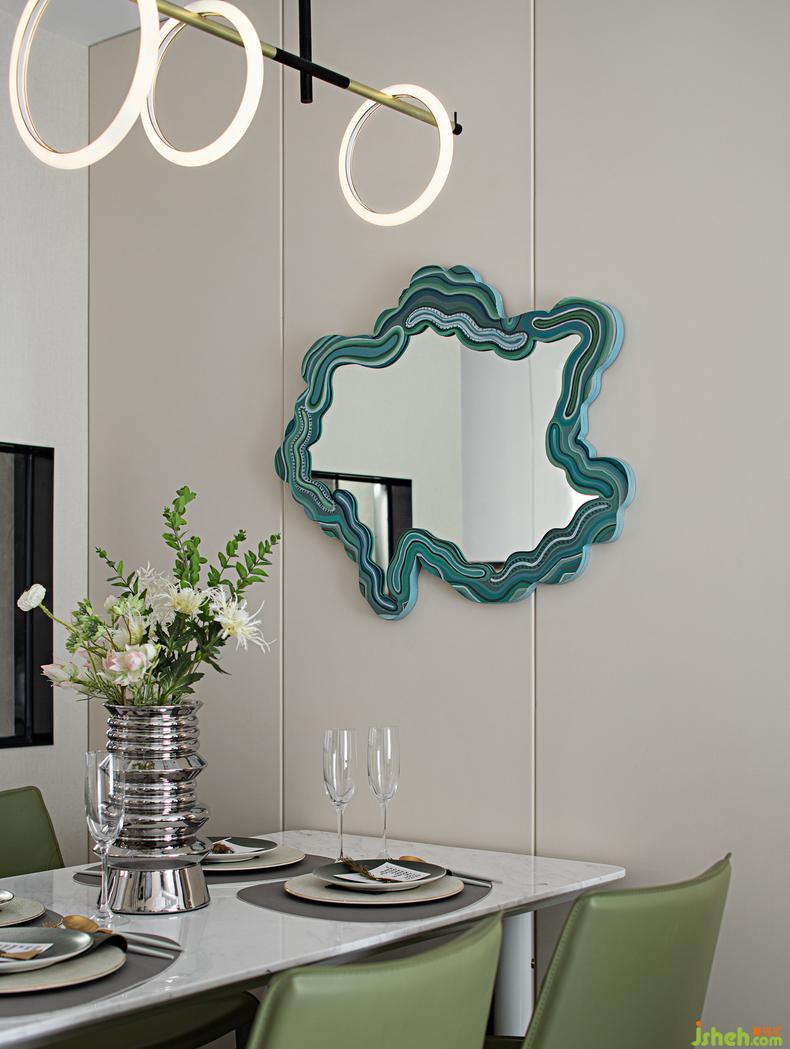 對(duì)潮流的熱愛總可以在餐廳區(qū)域有著超越時(shí)空的呈現(xiàn),創(chuàng)意十足的環(huán)裝疊加式頂燈,樣板房設(shè)計(jì)不規(guī)則的空間浮雕餐邊鏡,搭配著讓視野足夠舒適的星云綠花藝布景的桌幾,簡(jiǎn)卓設(shè)計(jì)的餐椅讓餐廳跳脫出傳統(tǒng)的認(rèn)知,每一處細(xì)節(jié)都是作品。