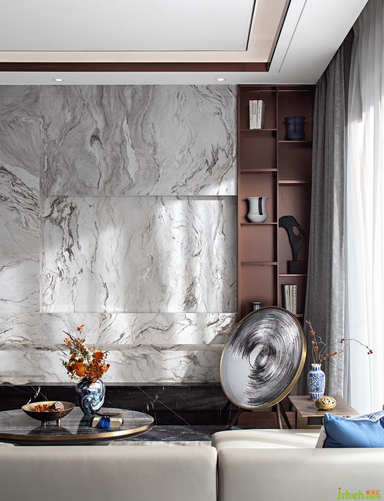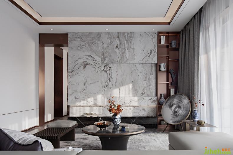 從餐廳看向客廳丨長(zhǎng)型空間加強(qiáng)了深邃的縱深感,大理石面如同遠(yuǎn)山畫作,樣板房設(shè)計(jì)尤顯靈動(dòng)雅致,利用水墨元素定制的藝術(shù)音響,給予現(xiàn)代標(biāo)簽化之外的東方氣質(zhì)。